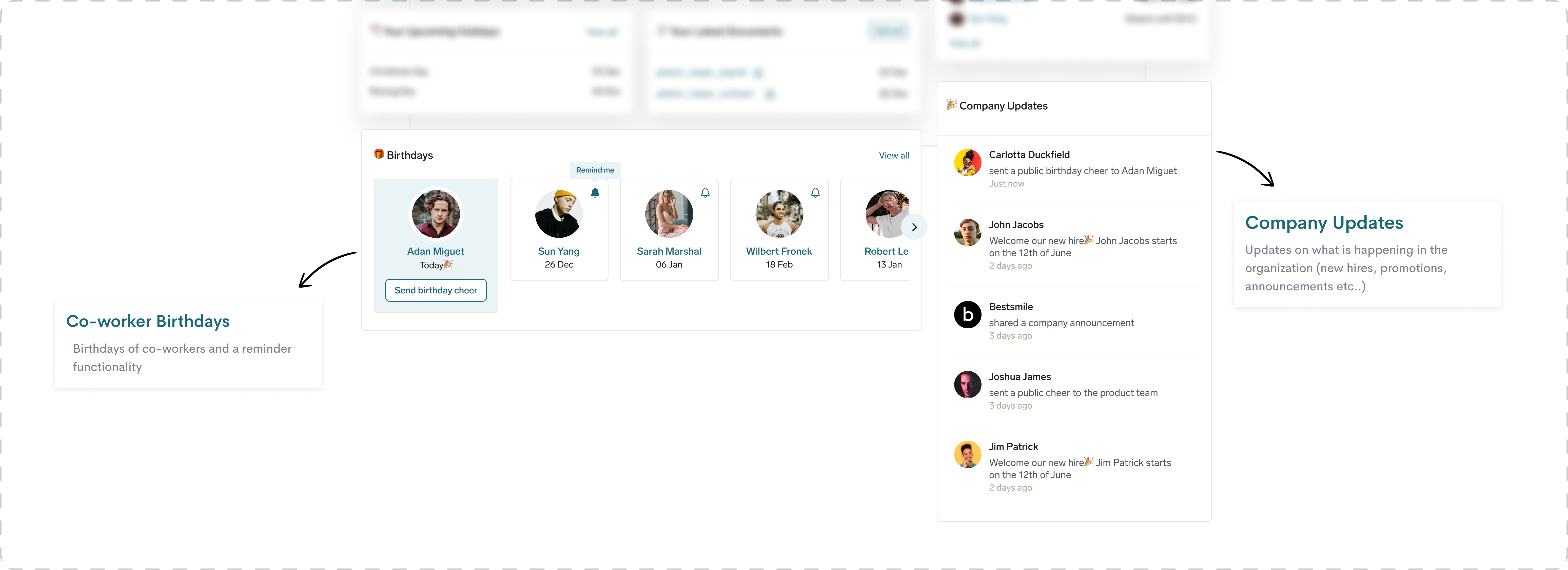 Less important data such as co-worker birthdays and company updates are grouped in a separate section and are placed below the more important employee data.