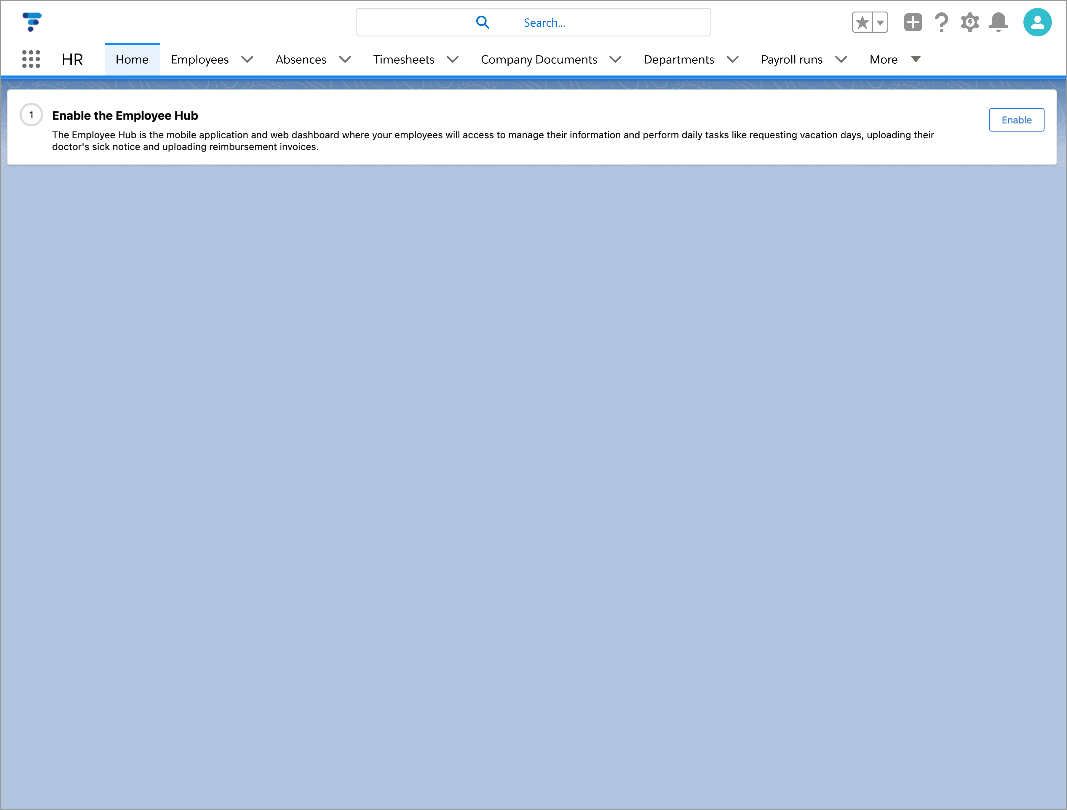 After installing our HR app on salesforce, the landing page shows a bland interface without any personalised onboarding experience for new users.