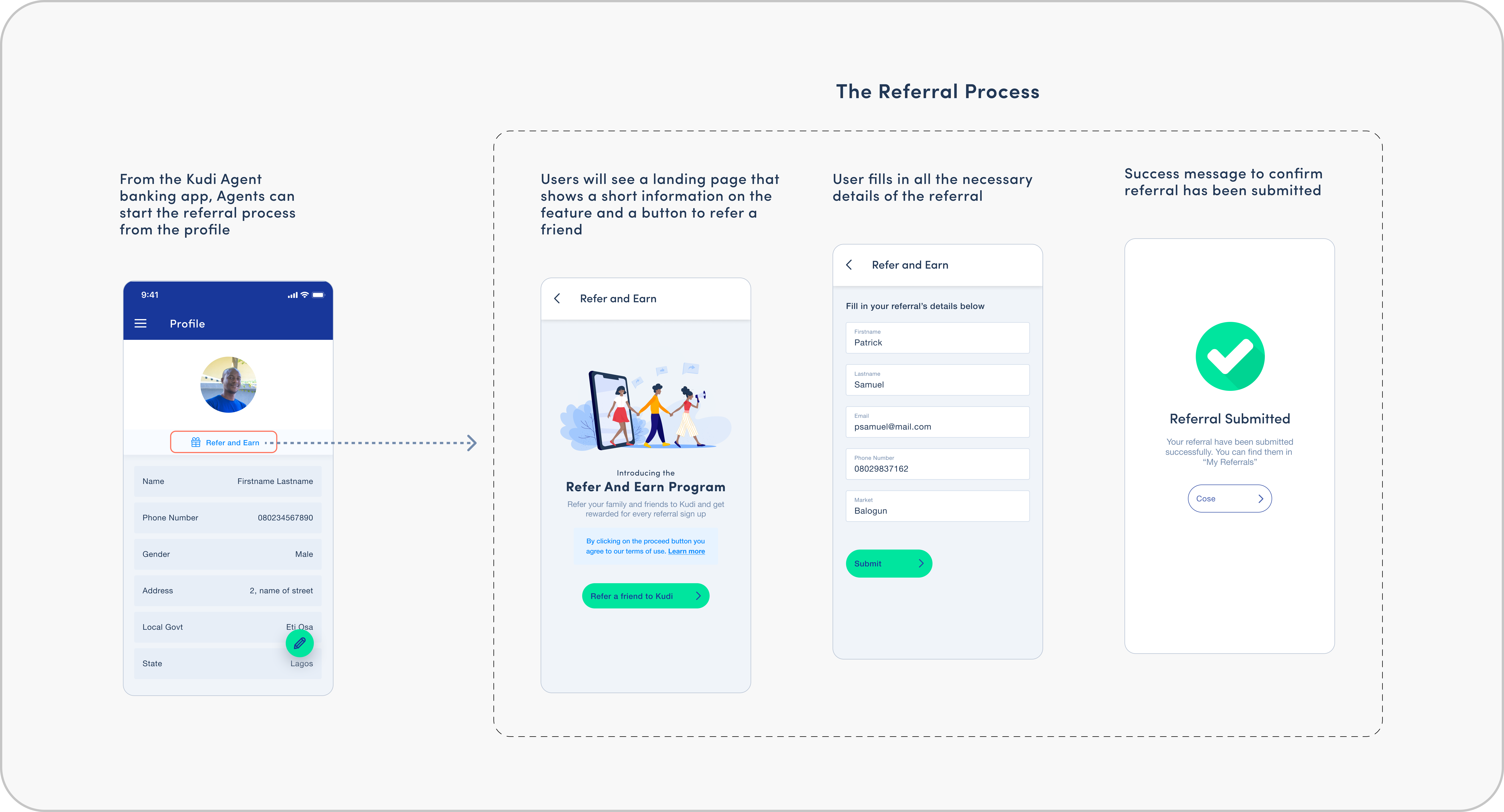 We implemented the referral feature by adding a "Refer a Friend" button on the Agents's profile page, this will take the user to the 'refer and earn' landing page where they see a brief description of the referral program, how it works and the cash incentive. The user can now go ahead to refer a friend by submitting the details of their friends and family members. As mentioned before, my approach to the design was to make it a simple and straightforward process.