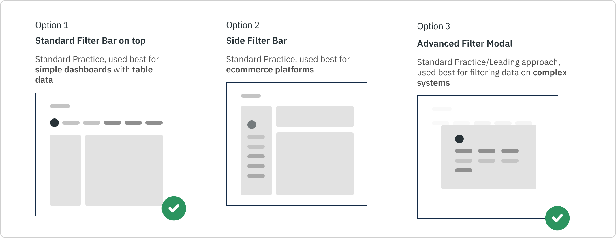 Every function or pattern has its own industry standard and different ways to design. So the next step was to design how the it's functionality: How might we position the filters? After doing some research and exploring different options, I came up with 3 different options of fetching our data.