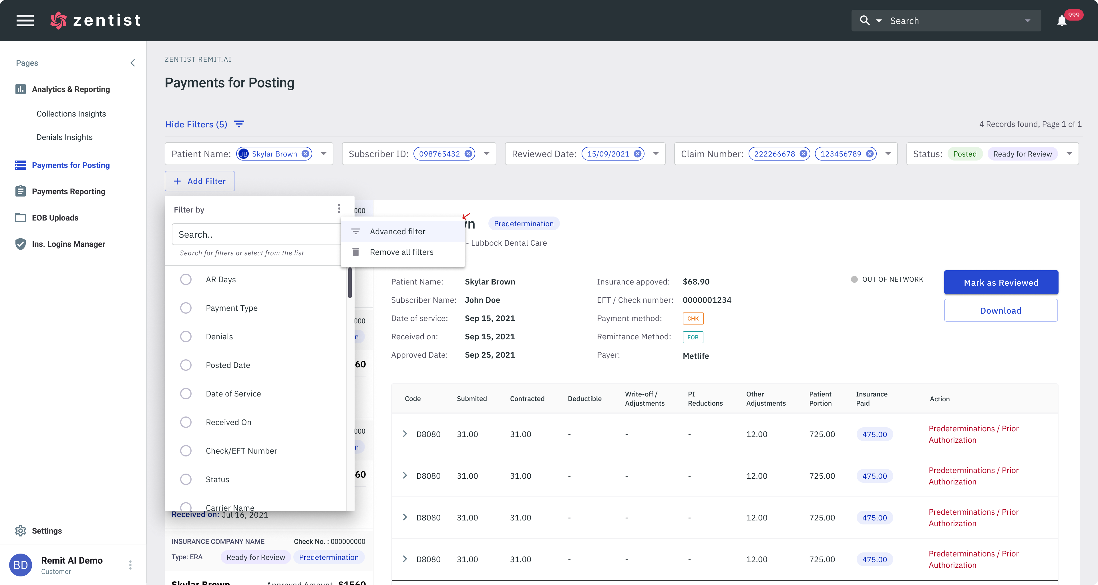 Zentist's Remit AI web app centralizes EOBs and ERA data from across 700+ insurance payers for faster payment posting and ease of reconciliation.